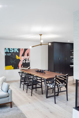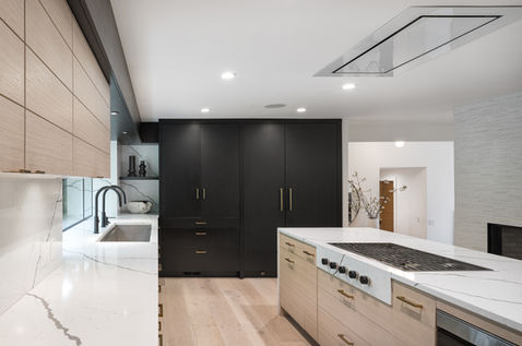 When this client first approached us, they were hoping to remodel their split-level ranch style home. Their wish list included redoing the kitchen, two existing bathrooms, adding a bedroom and bath on the lower level, new surfaces throughout and creating a more private and inviting outdoor living space. As typical of a lot of homes built in this era, the main level was completely choked by a massive brick fireplace that left the kitchen completely closed off from the living room. As this family loves to entertain, not only did we suggest taking down the massive fireplace and replace it with something that would open up the circulation of the house, but we also suggested flipping the kitchen and living room to create more flow and allow for better access to the backyard and new outdoor living space. We also created a larger ensuite primary bedroom and bathroom, adding a soaking tub and a walk-in closet with some creative space planning. The result is a kitchen that effortlessly lends itself to cooking and entertaining family and friends and every space feels welcoming and fresh highlighted with materials that feel organic.