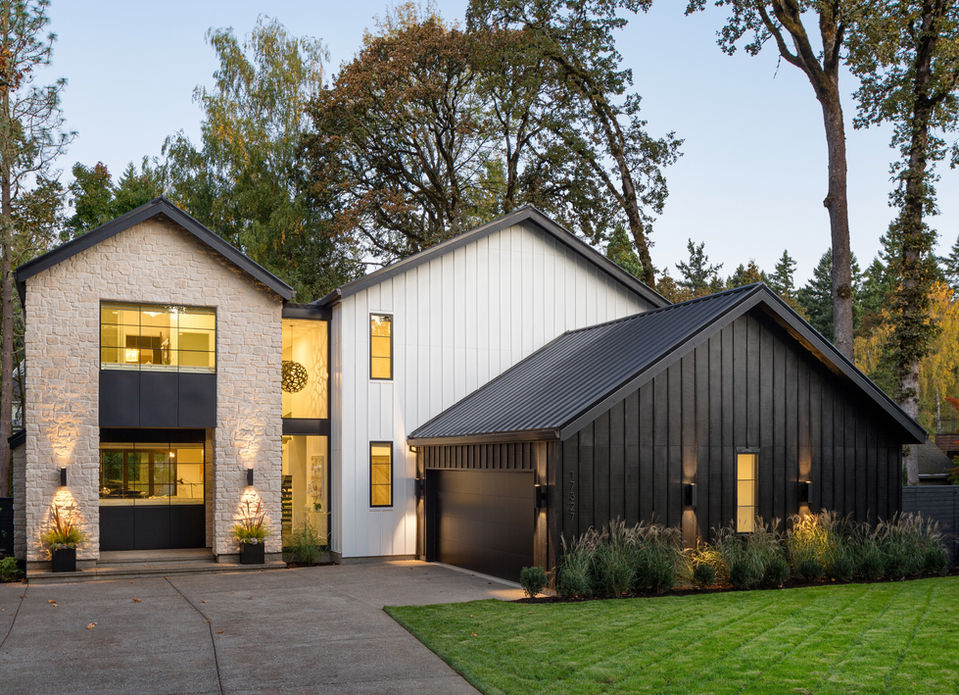 Our client's directive was a house that wasn’t too big, they didn’t want excess square footage and they wanted something that leaned toward farmhouse style. So we created our version of the modern farmhouse - an open-plan house with character, charm, and drama. We used reclaimed decorative beams, rich, dark, hand-scraped hardwoods, and just a splash of shiplap. We layered in the more modern elements - glass railings, a dramatic catwalk that overlooks the kitchen and dining room below, and a show-stopping hot-rolled blackened steel fireplace to give this farmhouse a little edge. We flooded the house with natural light and captured the water view with large floor to ceiling windows. Statement lighting and wallpaper throughout the house echoed the personality and style of the family and gave the house its own unique identity. The exterior stonework combined with the black and white board and batten set the stage for the interior story. The result is a farmhouse, unlike any other and one that is uniquely our clients’ sanctuary.