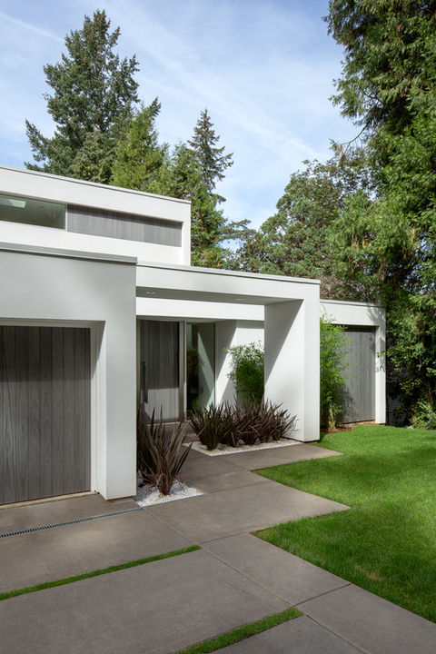 This ground-up new construction custom built home was inspired by a Southern California aesthetic, aiming to capture maximum natural light and take advantage of the private wooded property. The front of the house only hints at what awaits once you step inside. We saved the grandness for the back of the house which instantly invites you outside with the double height ceilings and walls of glass framing the rolling lawn down to the lake. Dramatic architectural arches are repeated in the front and back.